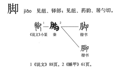 “脚”最古形体为《说文解字》小篆,但也见于先秦著作《墨子》。脚本义指小腿,即从膝盖到踝骨的部分,后来转指足,即胫以下接触地面的部分,引申为物体的下端。“脚”小篆作图1,左部为“肉”,作形旁,表义,意指“脚”的本义与肢体器官有关;右部为“却”,作声符,表音。形旁“肉”至隶书阶段演变为“月”。声符“却”战国时讹为“卻”,故“脚”也有两种写法,作“脚”与“腳”。现代整理汉字时以“脚”为规范字,“腳”被处理为异体字。